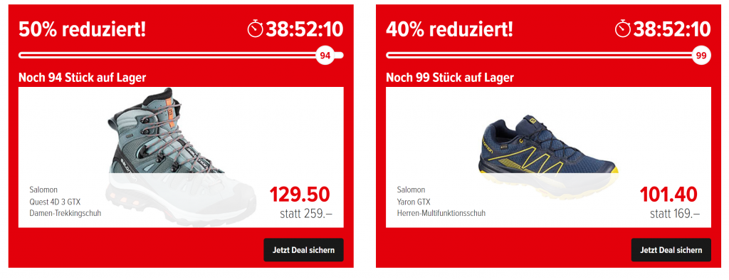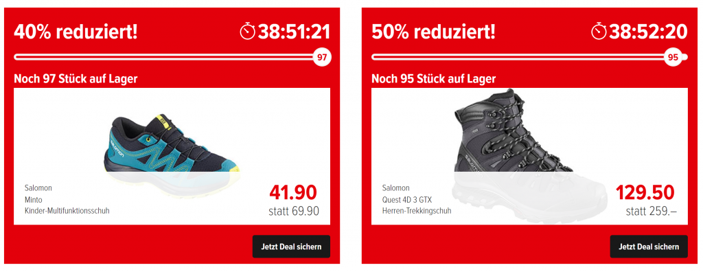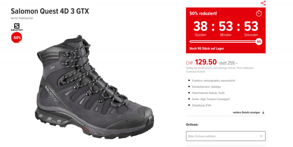 Beispiel: Salomon Quest 4D 3 GTX für CHF 129.50 abzüglich 10.- mit dem Newsletter Gutschein für CHF 119.50. Zweitbester Preis beträgt CHF 151.-