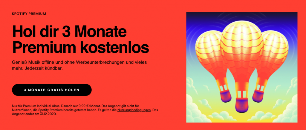 Nur für Premium Individual Abos. Danach nur Fr. 12.95/Monat. Das Angebot gilt nicht für Nutzer*innen, die Spotify Premium bereits getestet haben. Es gelten die Nutzungsbedingungen. Das Angebot endet am 31.12.2020.