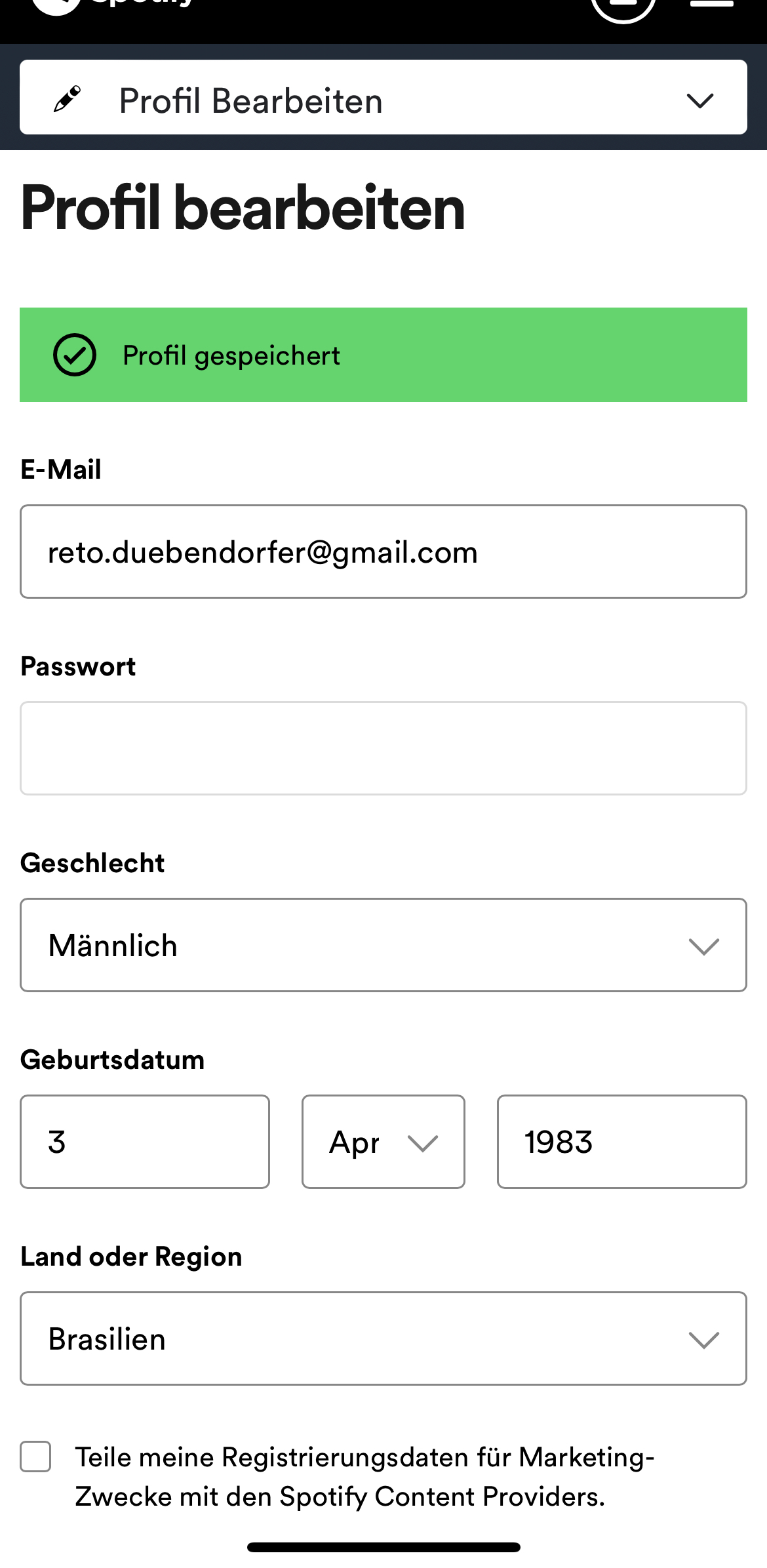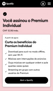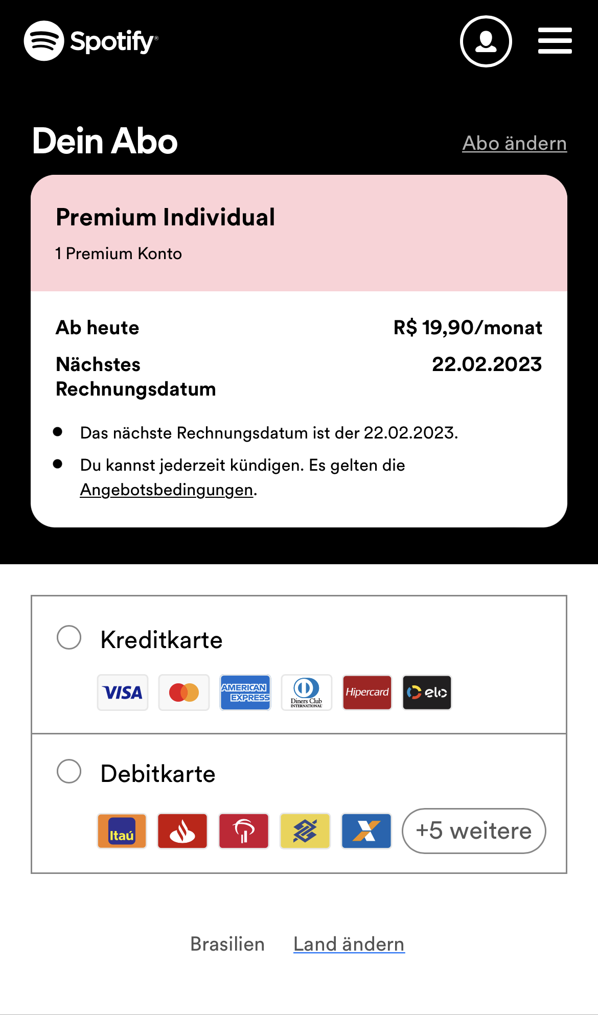 Die aktuellen Kosten bei Spotify Brasilien sind: CHF 3.60 (Premium) / CHF 4.50 (Duo) / CHF 6.30 (Family) pro Monat