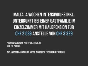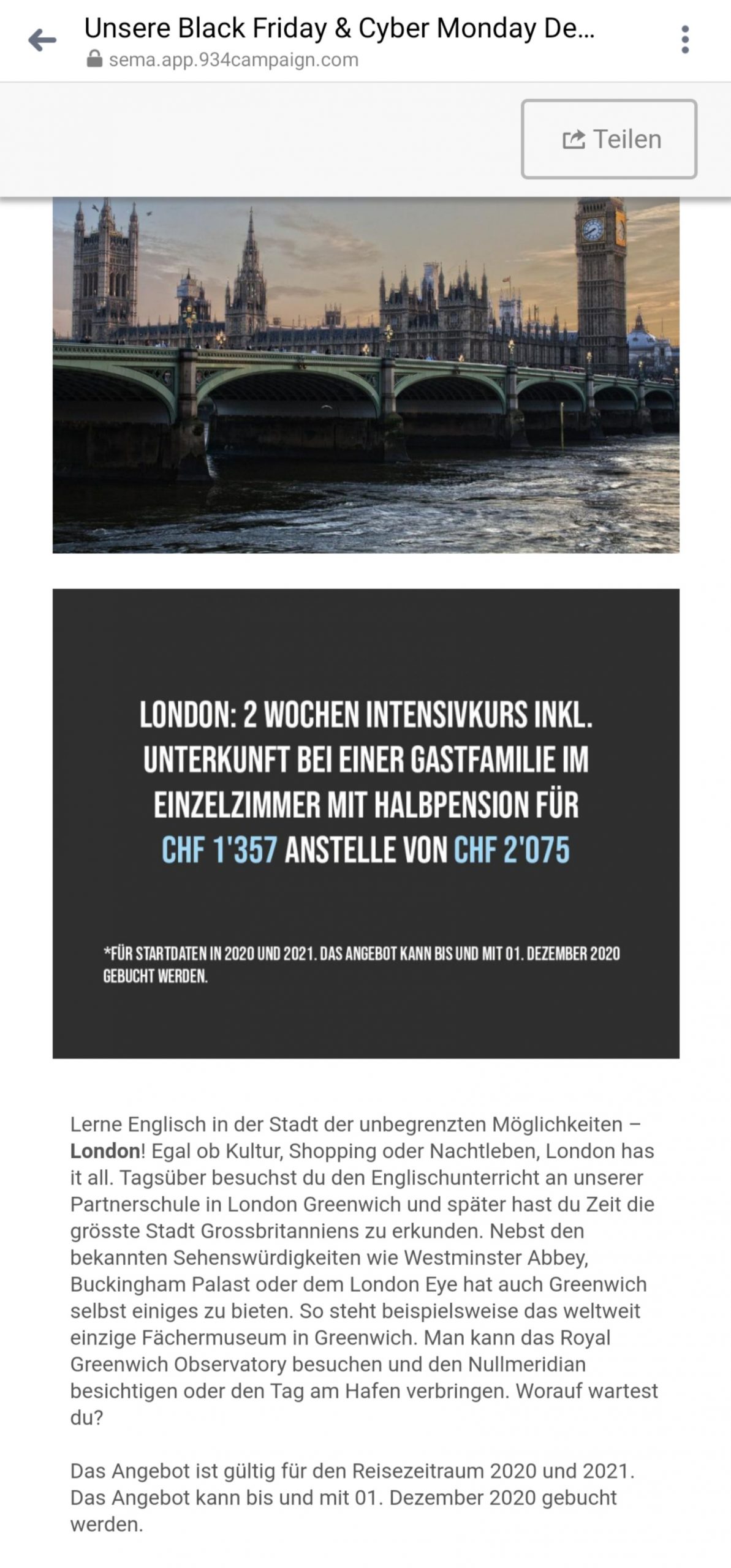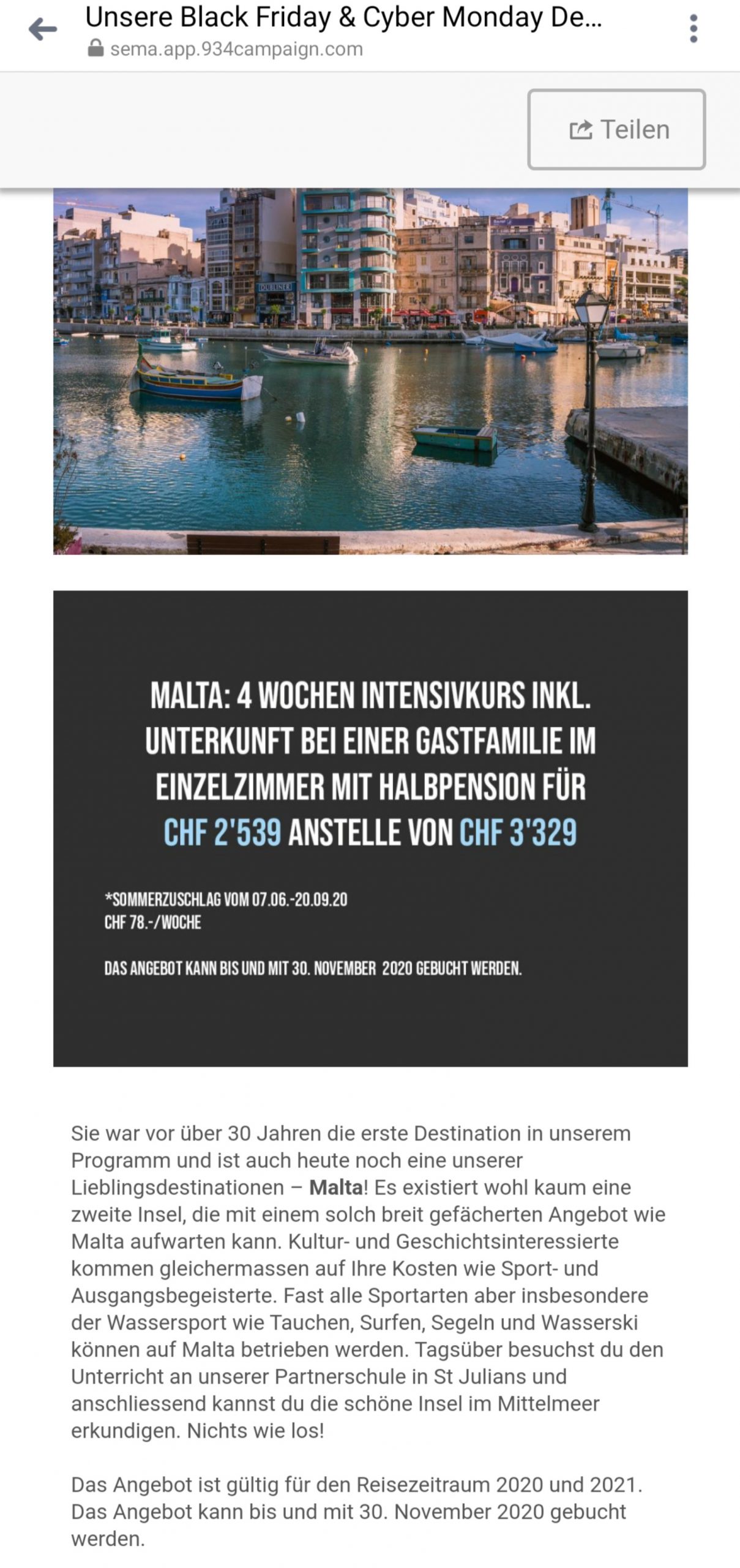 Habe eben via Newsletter das Black Friday / Cyber Monday Angebot von Sema Sprachreisen erhalten. Meiner Meinung nach recht cool falls einer von euch im kommenden Jahr gerne sein Englisch verbessern möchte. Es gibt ca. 25% respektive 35% Rabatt (habe das für euch berechnet, sie geben keine Prozentangaben sondern einfach zwei Preise an). Es sind zwei konkrete Angebote, einmal Malta und einmal London.