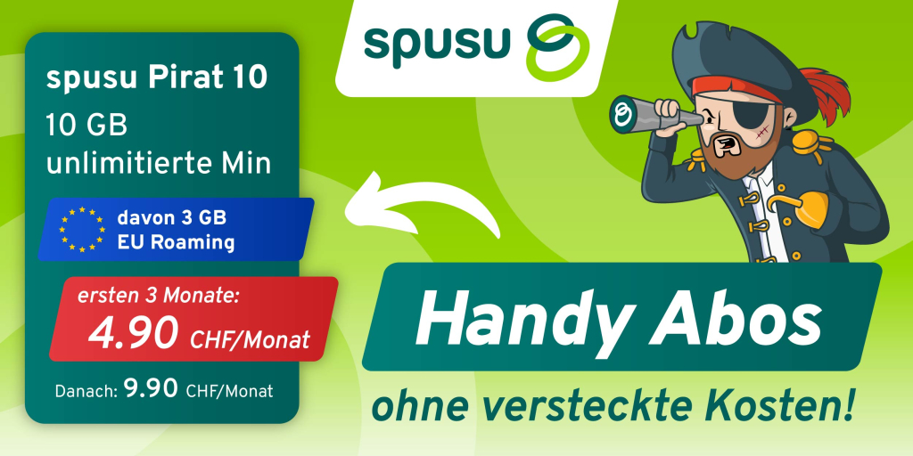 Mit diesem Angebot profitiert ihr von 10GB Datenvolumen, unlimitierten Anrufen und SMS in der Schweiz. Zusätzlich im Abo inbegriffen sind 3 GB Roaming in der EU/UK. Die ersten 3 Monate kostet das Abo nur CHF 4.90 danach CHF 9.90! Weitere Vorteile von diesem Abo sind, dass man das Abo jetzt abschliessen kann und anschliessend 6 Monate Zeit hat, um es zu aktivieren. Man kann also entspannt alles koordinieren und das alte Abo kündigen und auch eine eventuelle Kündigungsfrist problemlos einhalten. Bei spusu hat man ausserdem jederzeit die volle Kontrolle über allfällige Kosten: Nutzer können in der spusu-App oder auf der Website individuelle Ausgabenobergrenzen für Anrufe, SMS und Daten festlegen, die über die enthaltenen Leistungen hinausgehen. Einfach den maximalen Betrag für zusätzliche Dienste eingeben, um vor unerwarteten Kosten geschützt zu sein. Bei einem Limit von 0 CHF sind keine zusätzlichen Leistungen möglich.