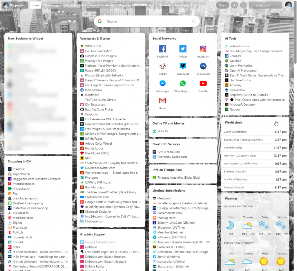 - Pages with links, I have a homepage for personal use and then I have a work page with all the links related to my job. They are separate so I can switch between them at any time.