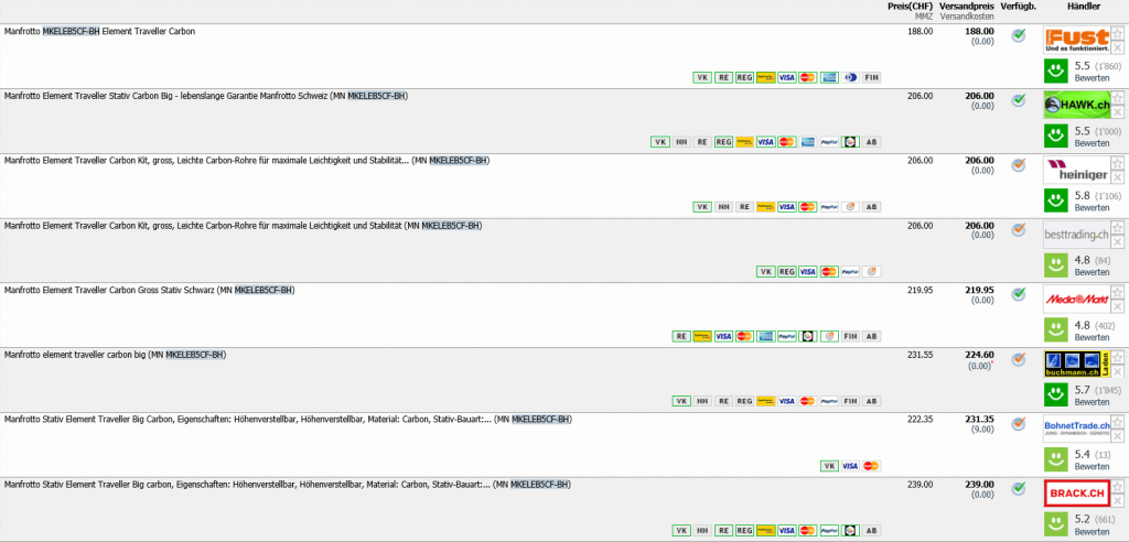 Leider gibt es für das Stativ keinen Preisverlauf auf toppreise, als zweitbester Preis werden über die manuelle Suche 188.- CHF ausgegeben (von Fust). Dies deckt sich mit comparis, wo es zu dem Produkt einen Preisverlauf hat und 188.- CHF als best price bislang aufgeführt werden.