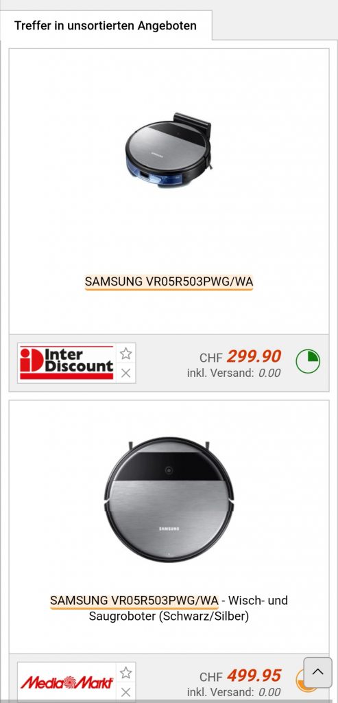 Bei Daydeal und Interdiscount gibts zurzeit den Saug- und Wischroboter Samsung VR05R503PWG/WA zum Aktionspreis von CHF 289.- resp. CHF 299.90. Laut toppreise sollen die Preise sonst erst bei knapp 500 Franken starten.