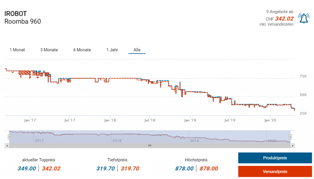 Im myrobotcenter kriegt ihr derzeit den Roomba 960 inkl. 5 Jahre Garantie zum Bestpreis von CHF 349.-. Wenn ihr mit Vorauskasse zahlt ergibt sich zudem ein weiterer Rabatt von 2%. Dieses Angebot scheint es ein Weilchen zu geben, ich habe aber keinen Deal dazu hier auf Preispirat gefunden.