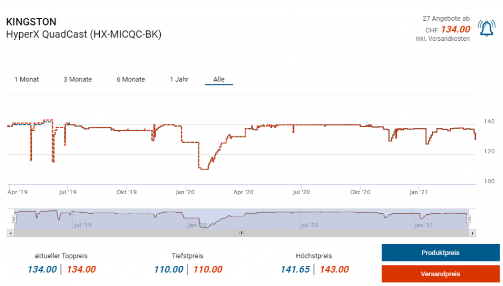 Bei amazon.de gibts derzeit das Streamer-Aufnahmegeräte HyperX QuadCast zum Aktionspreis von knapp 120 Franken. Laut toppreise liegt der Vergleichspreis derzeit bei 134 Franken.