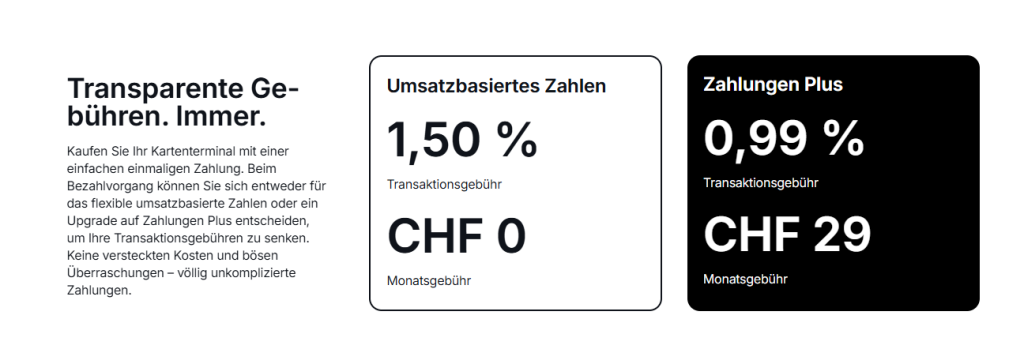 Das SumUp Solo gibt es noch für kurze Zeit bei SumUp direkt zum Black Friday Preis von CHF 49.-. Hatte das Gerät vor einigen Jahren selber einmal im Einsatz und war sehr zufrieden. Die Gebühren dafür sind auch sehr transparent und überschaubar: