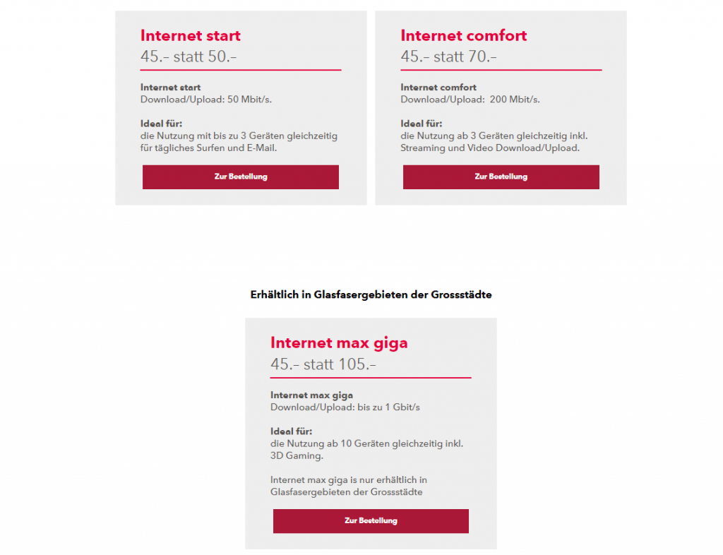 Vor allem beim Max Giga ... Glasfaserinternet für 45.- ist genial - das Dumme nur: Die Glasfasergebiete sind selbst in den Grossstädten nicht flächendeckend.