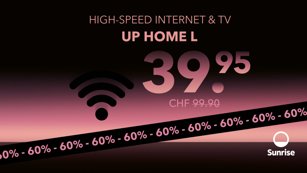 Bis zu 60% auf ausgewählte Internet- + TV-Abos, z. B. Up Home L für CHF 39.95/Mt. (statt 99.90/Mt.) während 24 Monaten. Verfügbar für Neu- und Bestandskunden.