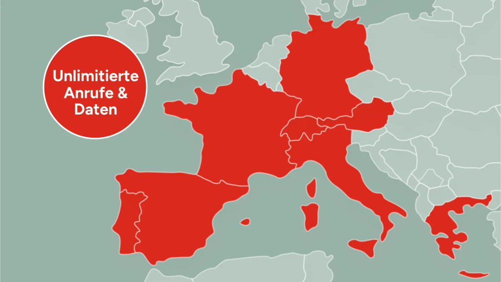 - Inklusive Roaming in der Schweiz, Deutschland, Frankreich, Italien, Österreich, Liechtenstein, Spanien, Griechenland und Portugal
