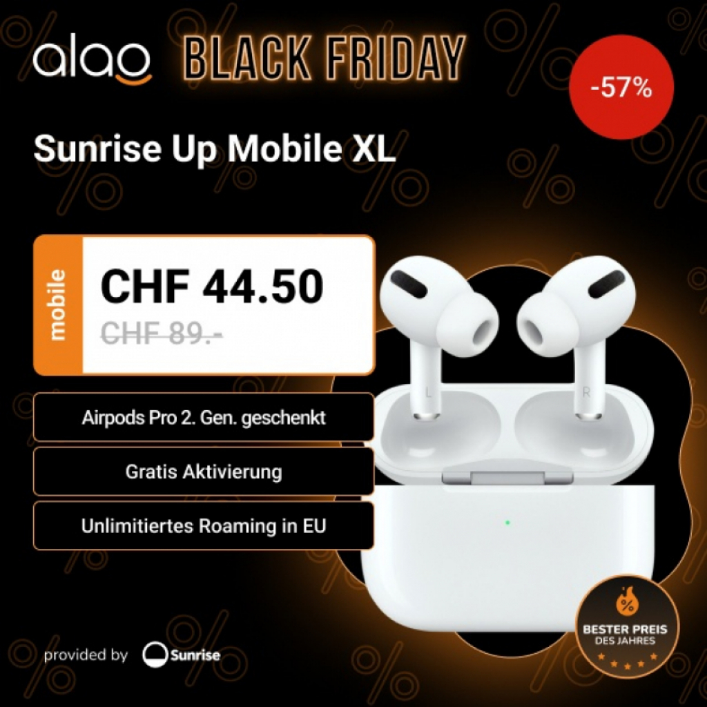 So profitiert ihr wie bei Sunrise direkt von einem reduzierten Preis für das Mobilabo Sunrise Up Mobile XL. Ihr zahlt so monatlich noch 44.50 Franken, ausserdem gibt’s die neuen AirPods Pro 2 gratis dazu! Doch damit nicht genug, exklusiv bei alao erhaltet ihr auch noch einen Shopping-Gutschein im Wert von 100 Franken sowie 35 Franken Cashback ontop!