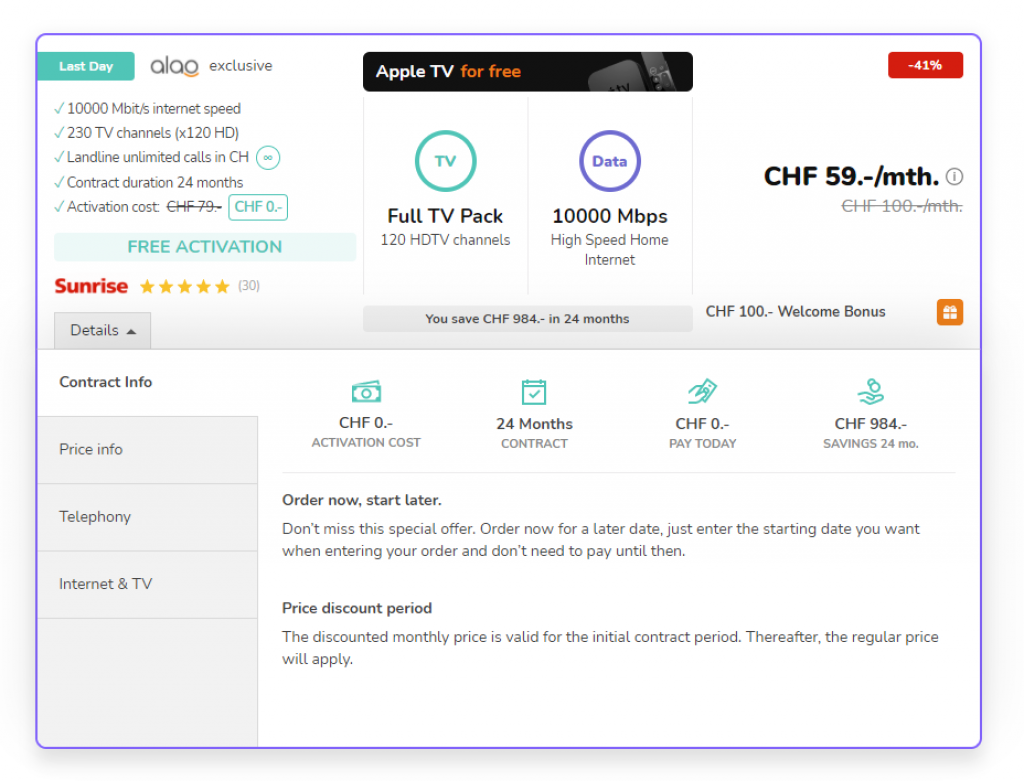 Bei Alao gibts derzeit ein weiteres starkes Angebot. So kriegt ihr das dickste Internet+TV-Abo von Sunrise zum Aktionspreis von 59 Franken pro Monat. Die Aktivierungsgebühren werden dabei geschenkt und es besteht eine Mindestvertragslaufzeit von 24 Monaten.