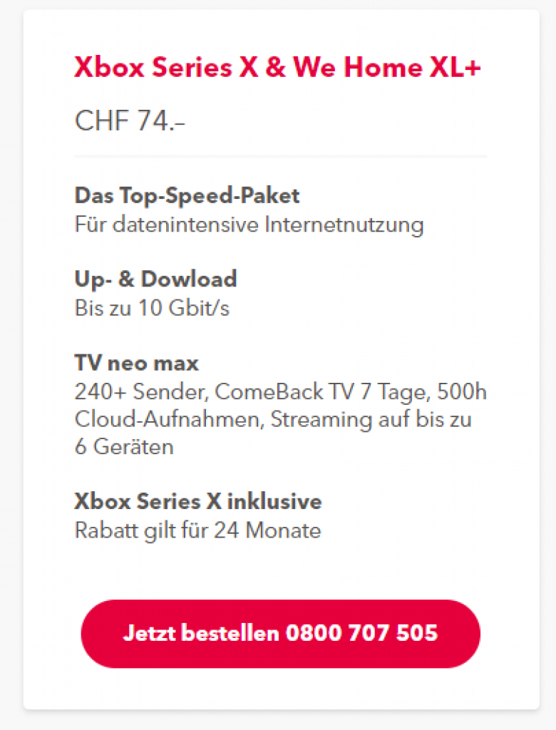 Das Angebot kostet CHF 74.-. Abzüglich der Xbox sind es CHF 53.- / Monat.