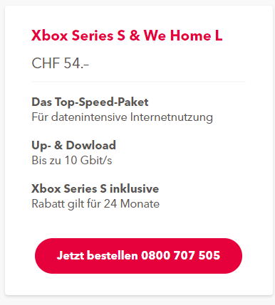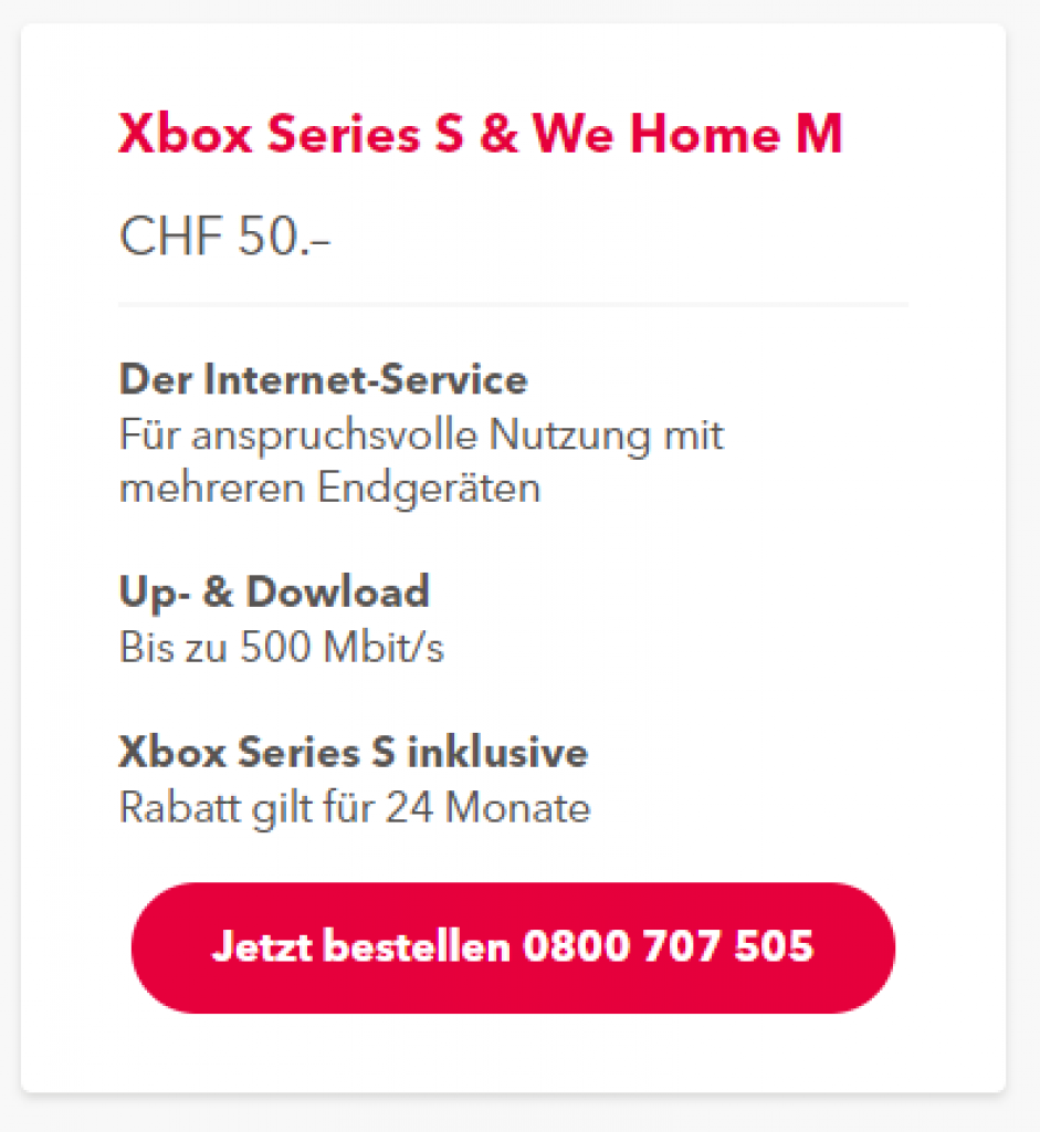 Bei Abschluss eines We Home Internet Vertrags, erhält man eine Xbox X oder S. Die Laufzeit beträgt 24 Monate.