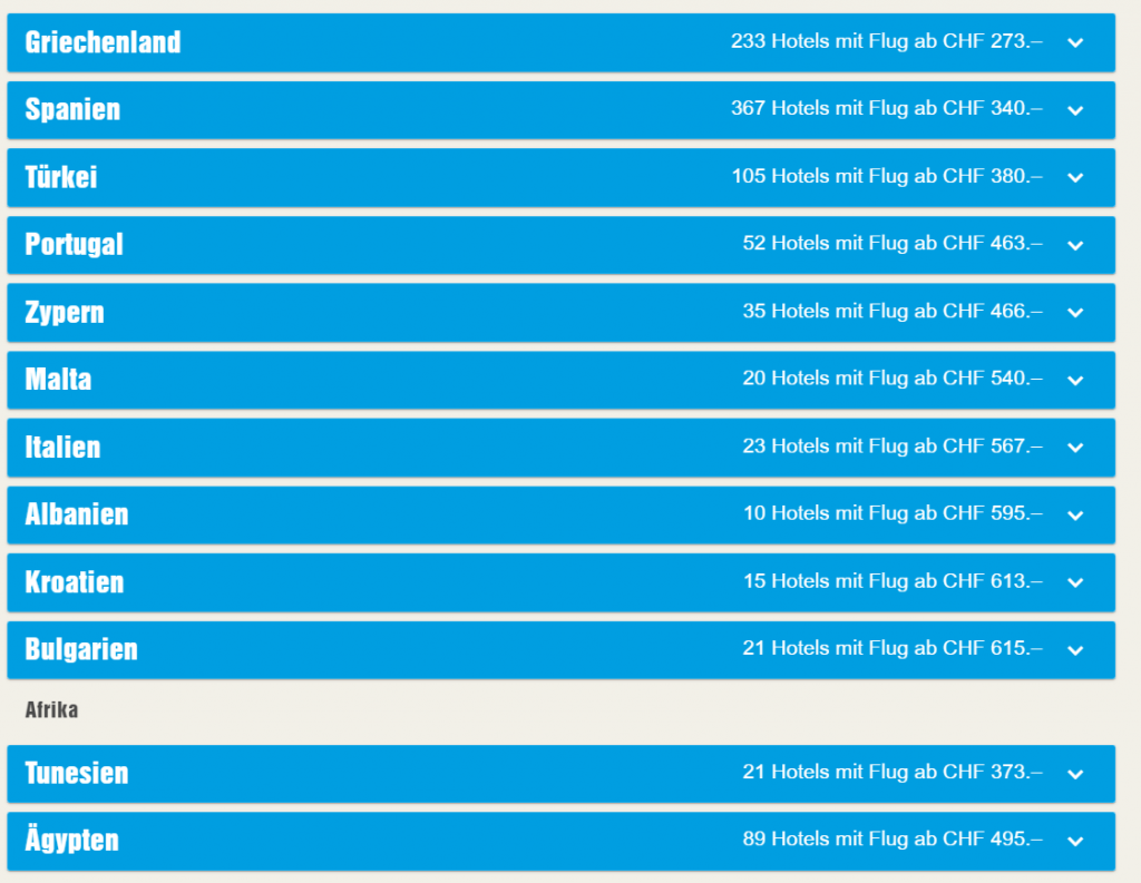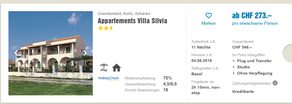 Bei ITS Coop gibt’s derzeit einige super Last Minute Angebote. Unter anderem 11 Tage Korfu inkl. Direkflug ab Basel und Transfers für zwei Personen pro Person für CHF 273.- Auch für andere Reiseziele gibt’s gute Preise: