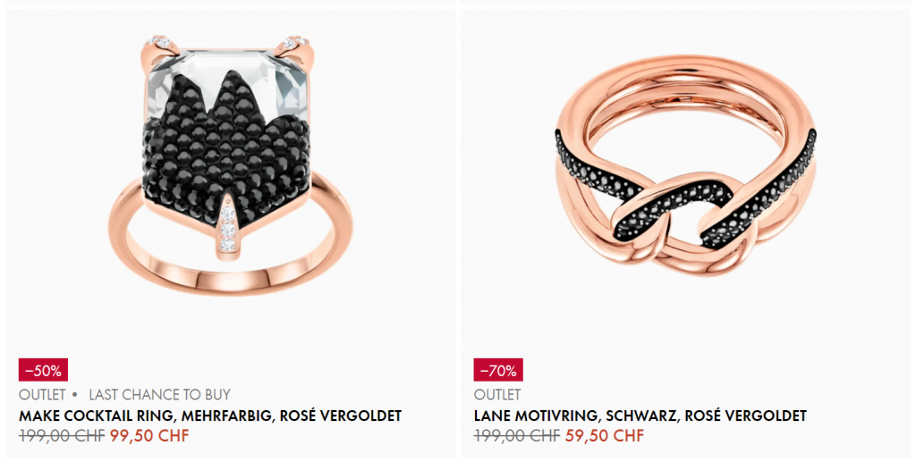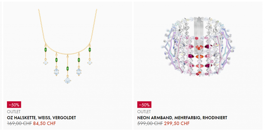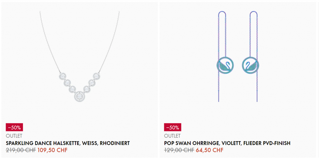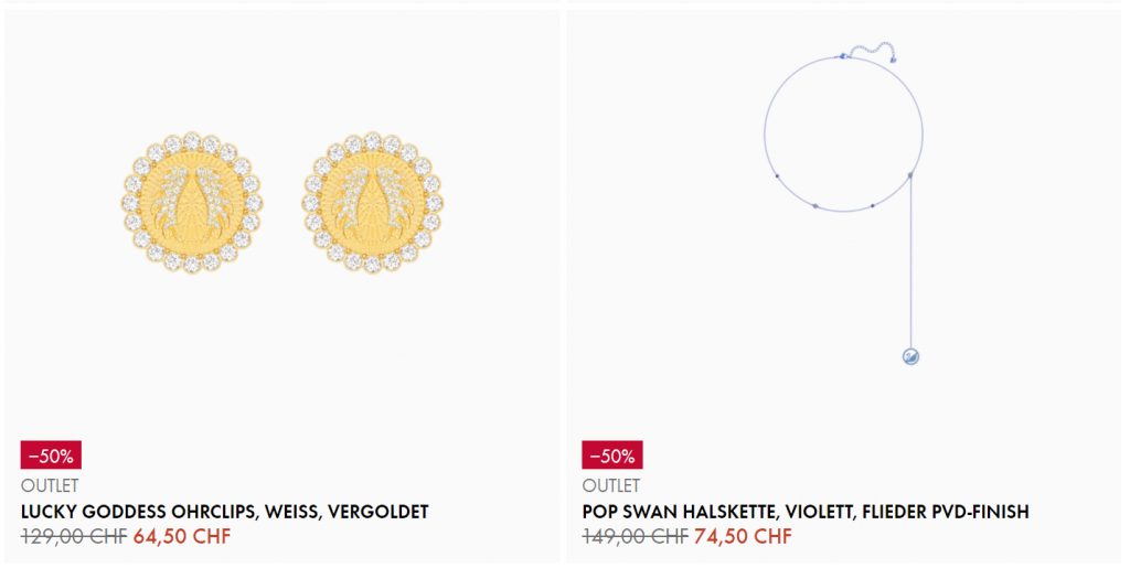 Swarovski verkauft in seinem SALE / Outlet Bereich derzeit viele Artikel mit 30-50% Rabatt. Einige Artikel sind sogar um 70% günstiger. Insgesamt hat es 481 Artikel derzeit mit mindestens 30% Rabatt. Hier ein paar Beispiele: