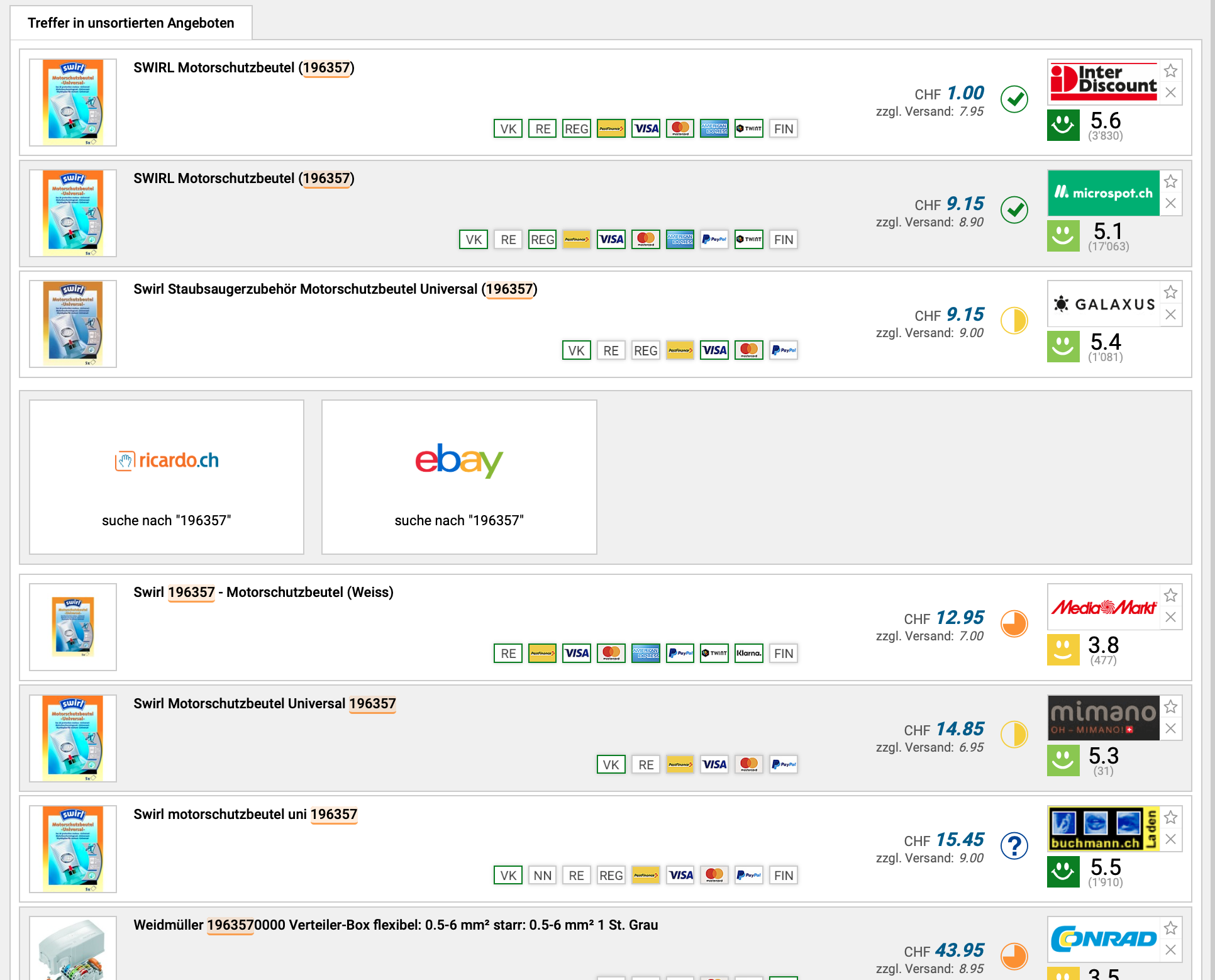 Beim Interdiscount gibt’s gerade SWIRL Motorschutzbeutel für CHF 1.- Zweitbester Preis beträgt CHF 9.15.-
