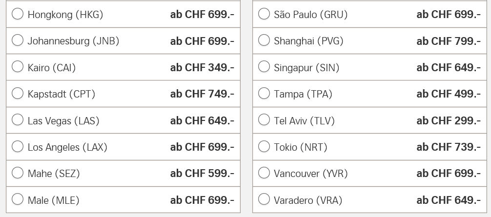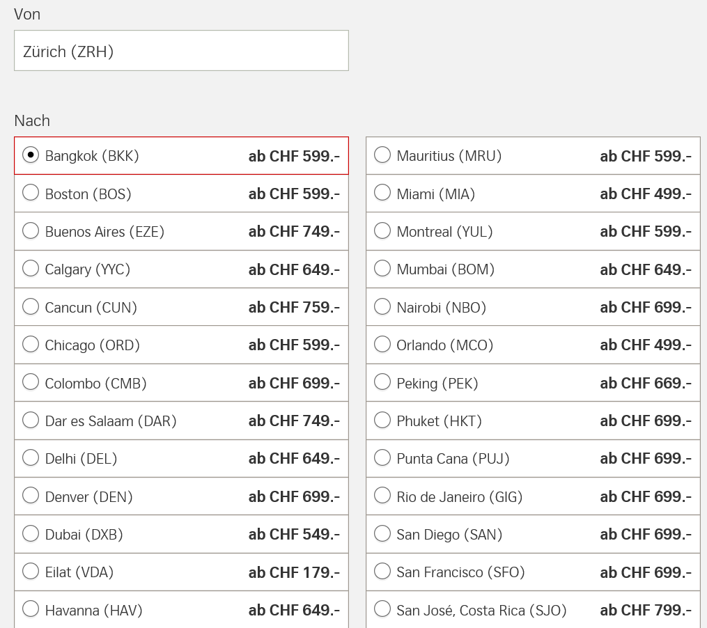 Leider Standard Angebot.. daher kein Deal. Schaut einfach auf Google Flights und Bucht es nicht direkt bei Swiss, so spart man nochmals