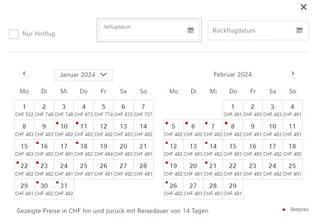 5. Danach könnt Ihr nach Wunsch euren Reisezeitraum auswählen (Daten mit dem roten Punkt „Bestpreis“ welche mit CHF 482.- angeschrieben sind)