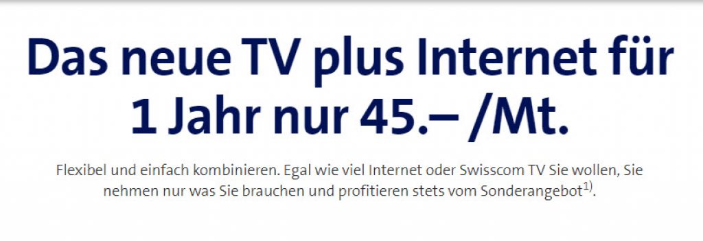 Das neue TV plus Internet (und Festnetz) für 1 Jahr nur 45.– /Mt. anstatt 160.–, was einem Rabatt von 72% entspricht!