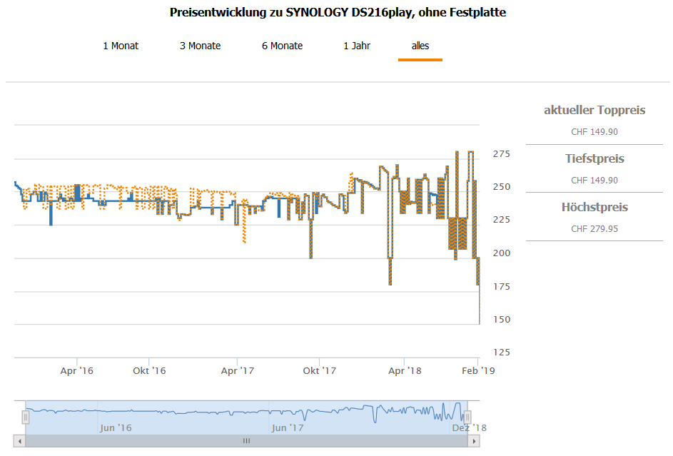 Bei interdiscount gibt es aktuell die SYNOLOGY DS216play, ohne Festplatte für 149.90 CHF.