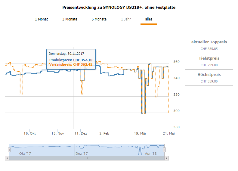 Bei Interdiscount gibts die Synology DS218 für CHF 299.- beim gleichzeitigen Kauf von 2 Festplatten. Die WD Red sind ebenfalls stark reduziert (8tb für CHF 216.- aktuell nirgends unter 371 zu erhalten und noch nie günstiger als 344.75 laut Toppreise!).