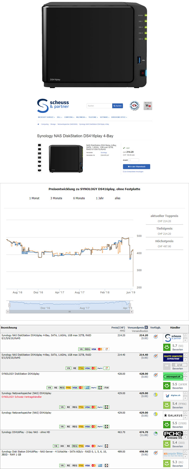 Bei Scheuss & Partner gibt es gerade die Synology NAS DiskStation DS416play 4-Bay zum Bestpreis von CHF 214.20 (eventuell handelt es sich hier auch um einen Preisfehler).