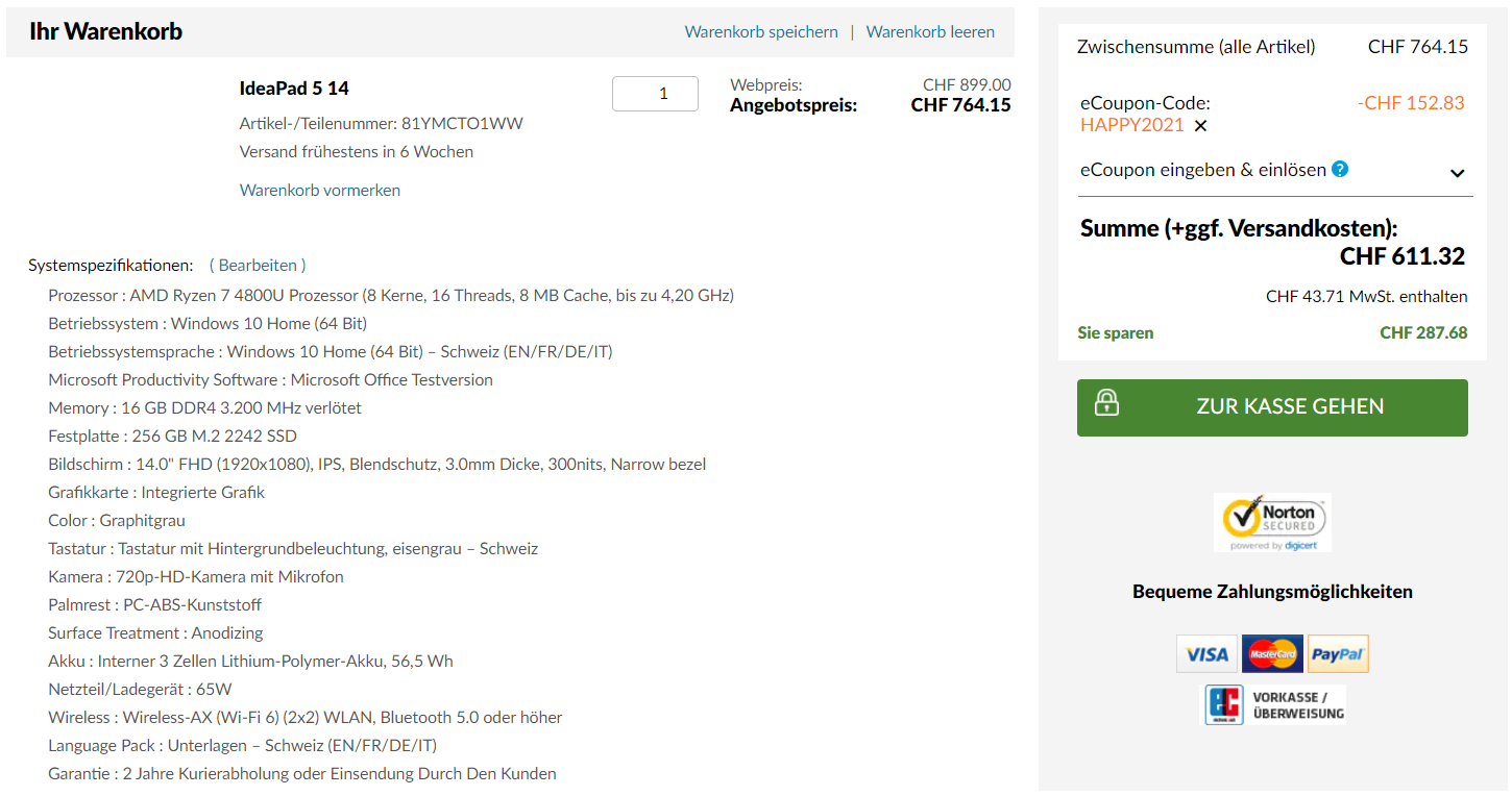 Im Lenovo Store gibts zurzeit einen Systemfehler wo eine andere CPU ausgewählt wird, wenn man den Laptop, in diesem Fall speziell das IdeaPad 5 14ARE05, selbst konfiguriert. Ob das auch bei anderen Notebooks klappt weiss ich indes nicht.