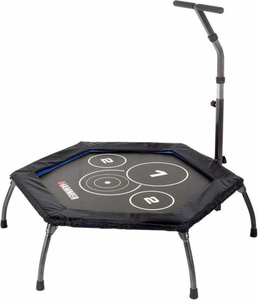 Das Hammer Fitness Cross Jump Fitnesstrampolin bietet dir ein effektives Workout, das bis zu 1000 Kalorien pro Stunde verbrennen kann. Durch die innovative Gummiseil-Federung werden deine Gelenke geschont, während bis zu 400 Muskeln gleichzeitig trainiert werden. Die kreisförmigen Jumping Points helfen dir, eine gleichmässige Schritt- und Übungsabfolge einzuhalten, was den Trainingserfolg beschleunigt. Die verstellbare T-Stange sorgt für zusätzliche Sicherheit und Stabilität, besonders für Anfänger und ältere Personen. So kannst du dein Training individuell gestalten und sicher ausführen