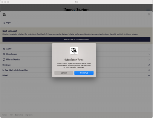 Wer den e-Paper des Tagis lesen, aber keine 26.- pro Monat ausgeben möchte, kann über Türkei das monatliche Abo für knapp 145 Lira erhalten. m.W.n. wird dies an die Email gekoppelt, sodass dies auch auf nicht-Apple-Geräte lesbar ist.