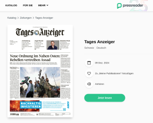 Im deutschsprachigen Raum bekommst Du den Tages Anzeiger nicht im PressReader. Du benötigst eine amerikanische Bibliothekskarte. Mehr kann ich dazu nicht sagen, weil ich nicht will, dass meine nicht mehr funktioniert.