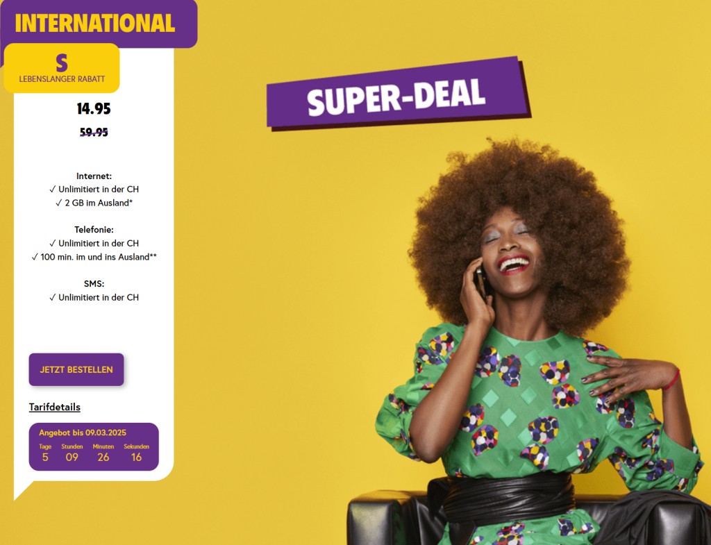 Bei TalkTalk ist das beliebte International S Abo wieder erhältlich – und das für nur 14.95 Franken pro Monat! Das Abo hat eine Mindestvertragslaufzeit von 24 Monaten. Zudem sind folgende Leistungen im Preis inbegriffen: