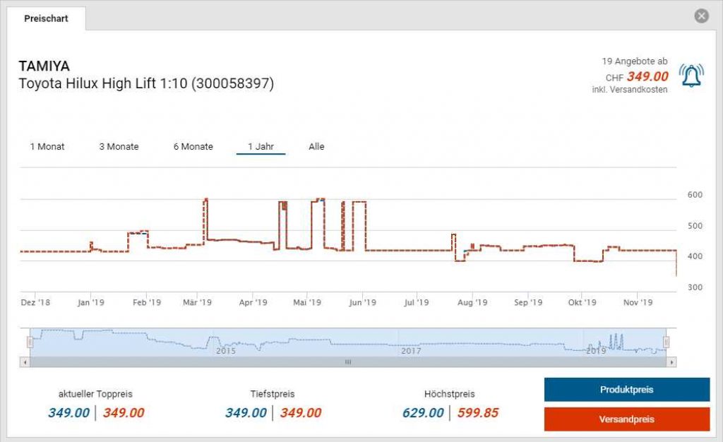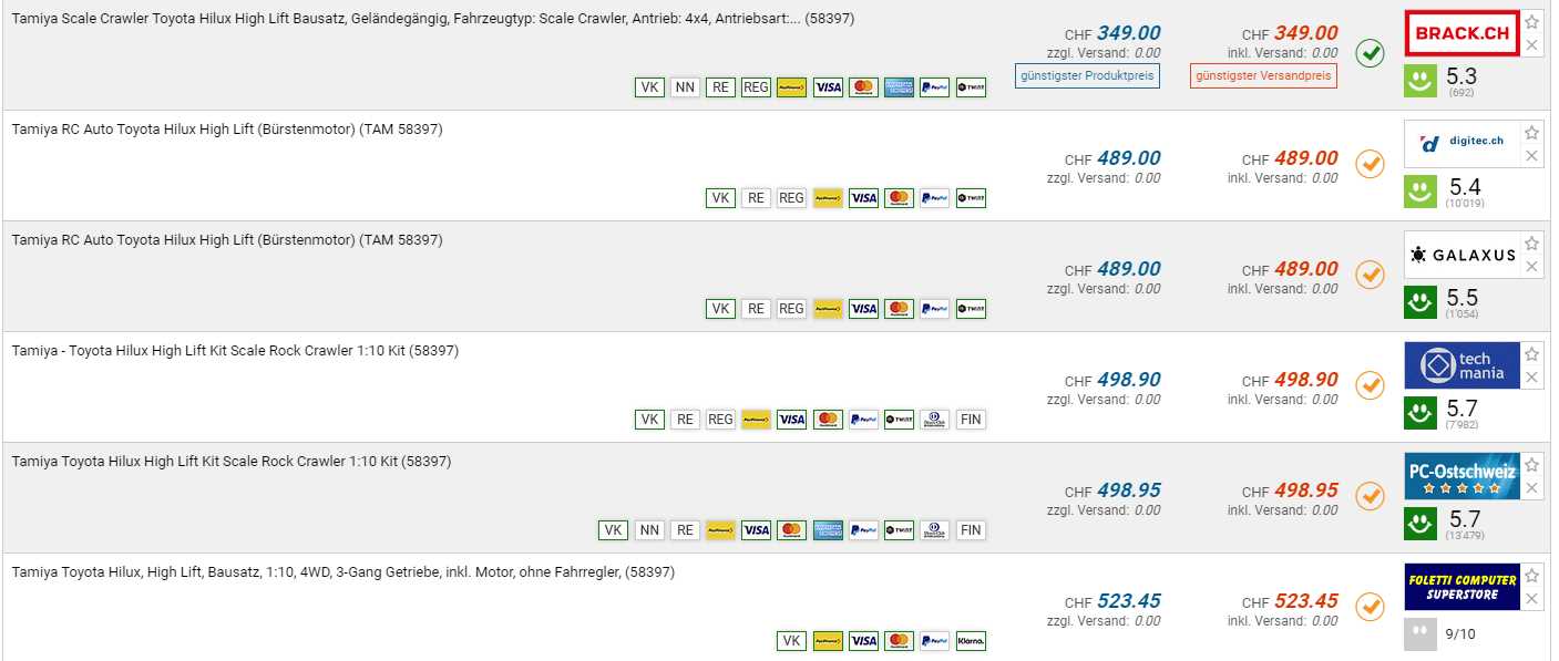 Bei Brack gibt es den TAMIYA Toyota Hilux High Lift 1:10 für den neuen Bestpreis von CHF 349.-. Der vorherige Bestpreis war CHF 397.-. Der zweitbeste Preis beträgt CHF 489.-.