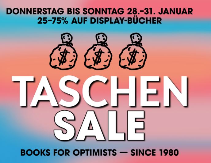 Beim weltweit renommierten Buchverlag „Taschen“ gibt es momentan einen Sale auf Display-Bücher. Rabatte von 25%-75% sind verfügbar, der Sale gilt in Stores und online. Gültig bis zum 31. Januar 2021.