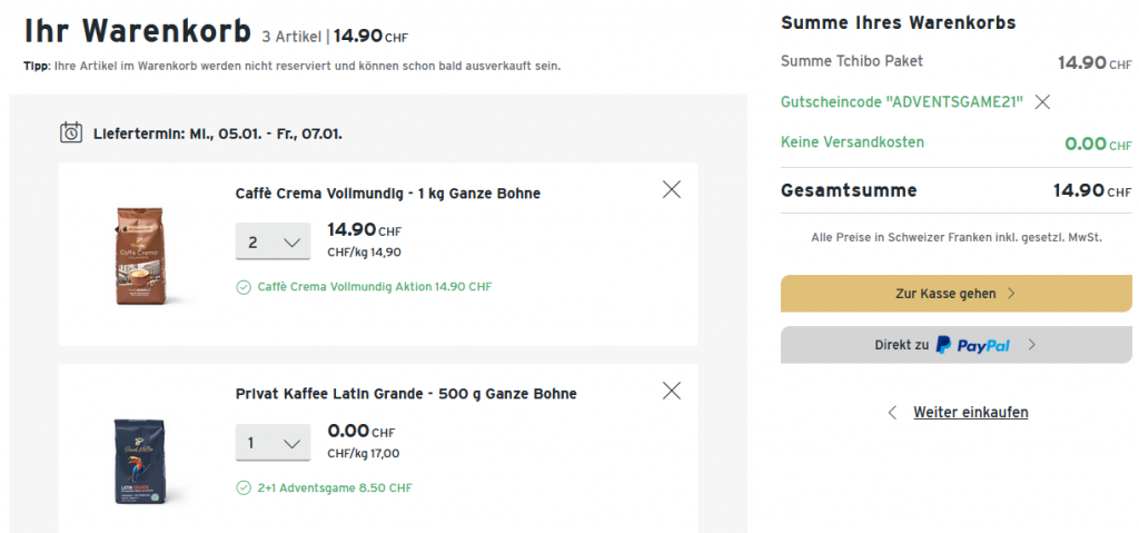Mit dem Gutscheincode ADVENTSGAME21 erhält Ihr noch zusätzlich eine gratis Filterkaffee Packung (250gr oder 500gr /Bohnen oder gemahlen - klein gedrucktes lesen) die Ihr auswählen könnt. Ebenso entfällt dann auch die Versandgebühr.