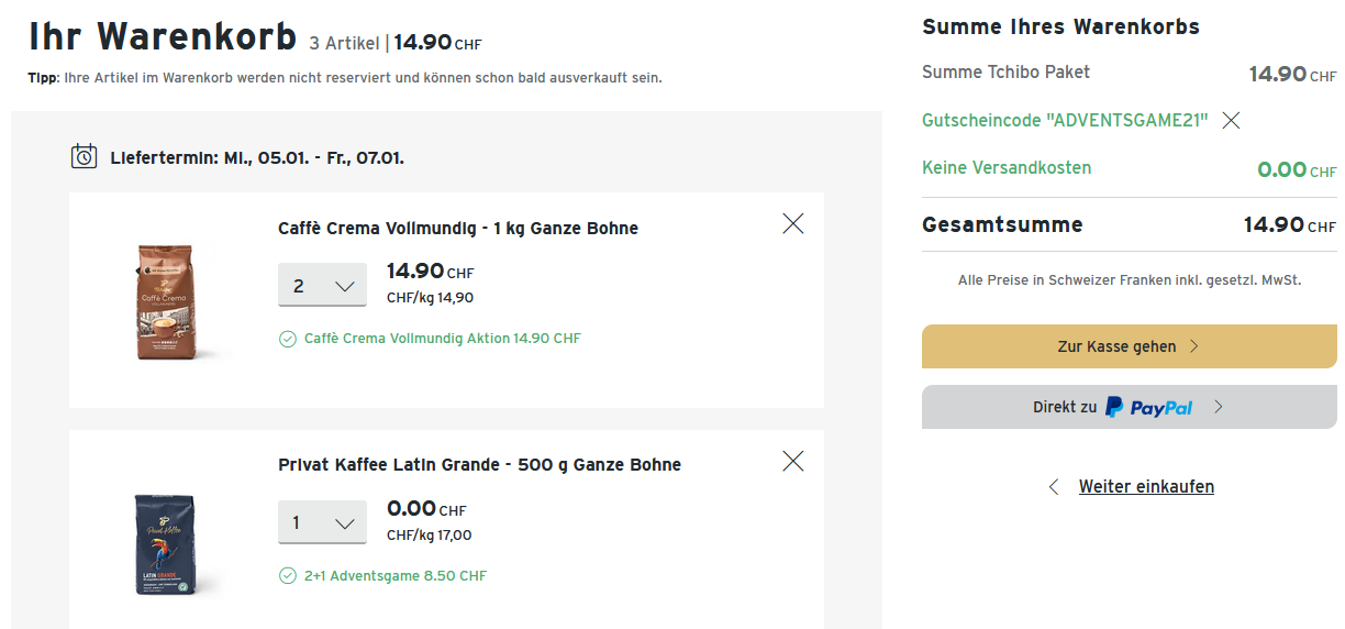 Mit dem Gutscheincode ADVENTSGAME21 erhält Ihr noch zusätzlich eine gratis Filterkaffee Packung (250gr oder 500gr /Bohnen oder gemahlen - klein gedrucktes lesen) die Ihr auswählen könnt. Ebenso entfällt dann auch die Versandgebühr.