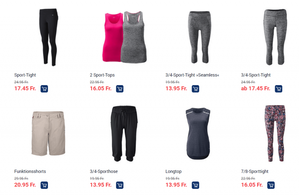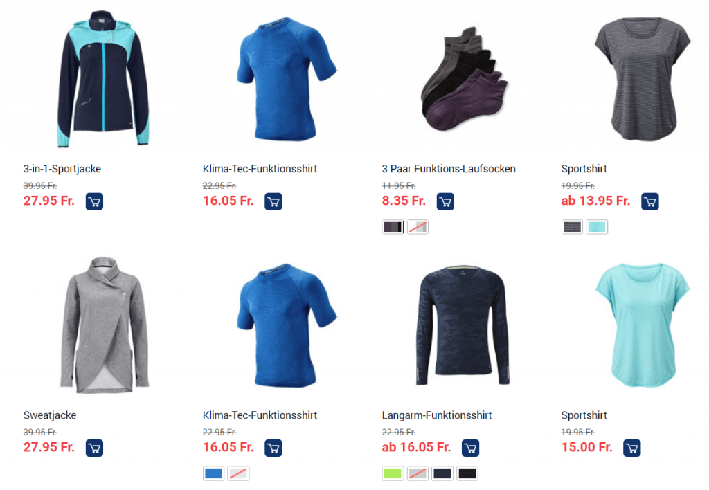 Die Auswahl ist riesig - leider sind aber schon einige Produkte ausverkauft. Vom Funktionsshirt, über Tec-Jacken, Rucksäcke, Gewichtsbälle, BlackRoll Klonen usw. ist alles mit dabei.