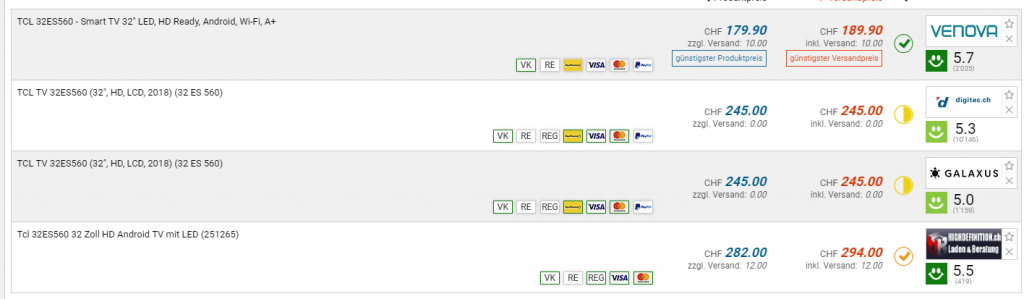 Bei Venova gibt es den TCL 32ES560 Smart TV 32″ für den neuen Bestpreis von CHF 189.90 (inkl Versand). Der vorherige Bestpreis war CHF 209.90. Der zweitbeste Preis beträgt CHF 245.-.