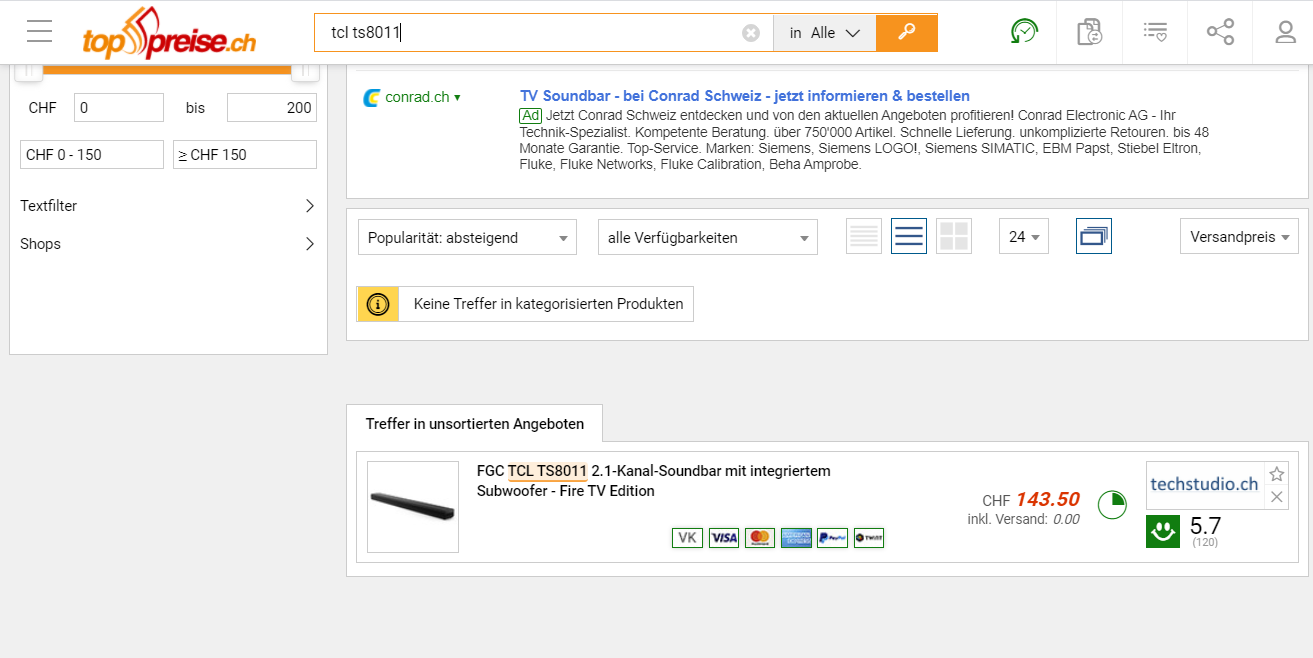 Bei Amazon gibts derzeit die Soundbar TS8011 mit integriertem FireTV-4K-Streaming-Mediaplayer und Subwoofer zum Aktionspreis von knapp 84 Franken. Laut toppreise gibts den Vergleichspreis für CHF 143.50 (allerdings bei nur einem Händler), bei Google Shopping lassen sich auch keine weiteren Vergleichspreise finden.