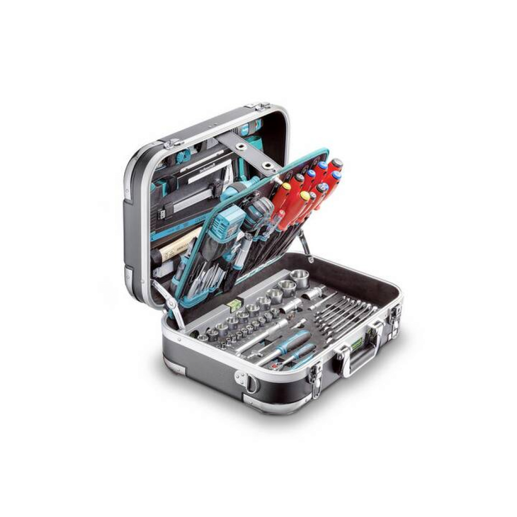 Sehr robuster und dauerhafter ABS-Schalenkoffer mit verchromtem Eckenschutz und Traggurt. Der Koffer beinhaltet 152 Teile und hat ein Gewicht von 13,6 kg.