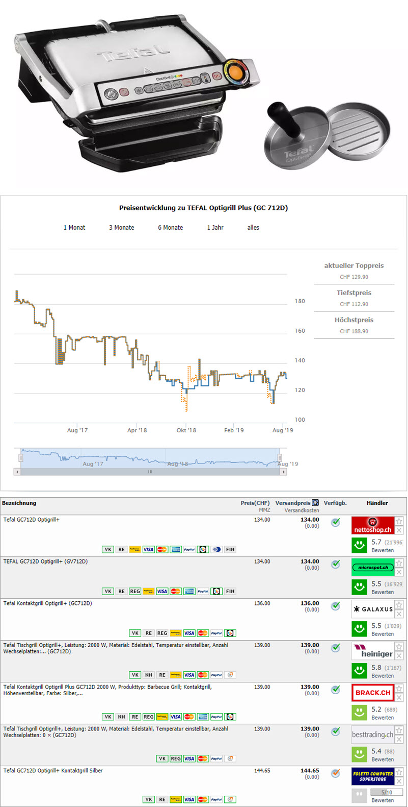 Momentan gibt es im Nettodeal bei Nettoshop den Tefal GC712D Optigrill+ Tischgrill inklusive gratis Hamburgerpresse zum Bestpreis von CHF 99.- wenn man beim Checkout den CHF 20.- Rabattcode VISNET-20-1907 verwendet.