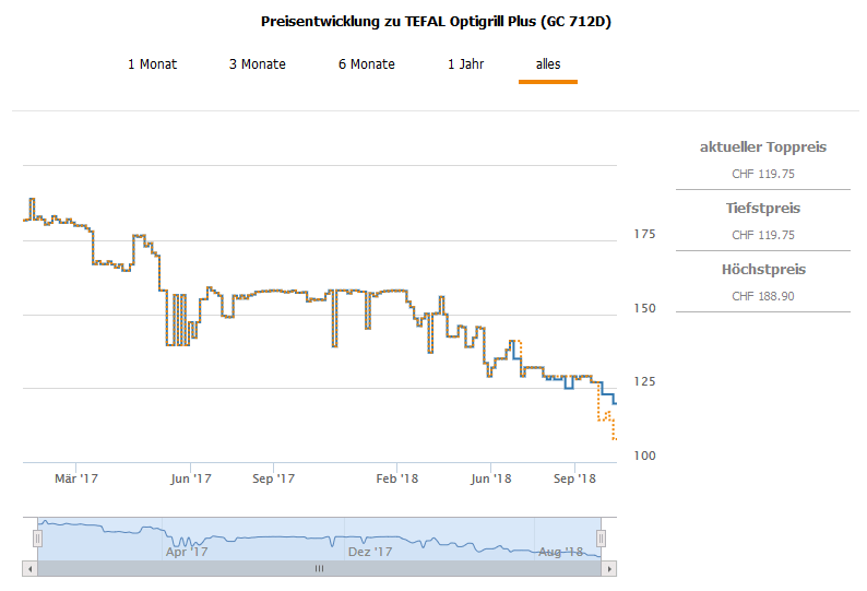 Den Optigrill Plus (GC 712D) gibt es aktuell für 114.- CHF, mit dem Gutscheincode kommt ihr als auf 99.- CHF. Zweitbester Preis aktuell und best price 107.75 CHF.
