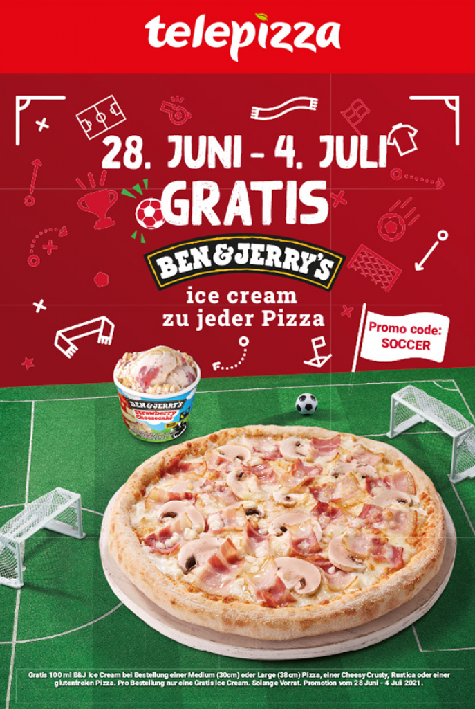 Bis zum 04.07. gibt es eine tolle Aktion bei Telepizza. Zu jeder bestellten Pizza gibt es mit dem Promocode “soccer” gratis ein 100ml Ben & Jerry’s Ice Cream dazu. Bestimmt nicht alle Welt, wer jedoch sowieso vor hatte zu bestellen, ganz nett. 😀