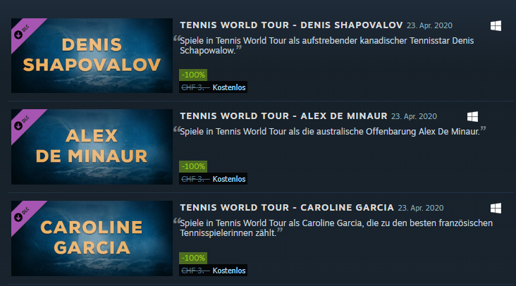 Im Steam Store gibt es bis zum 26. Apr. 21:00 Uhr folgende DLCs, zum Spiel “Tennis Word Tour” , gratis zum Download: