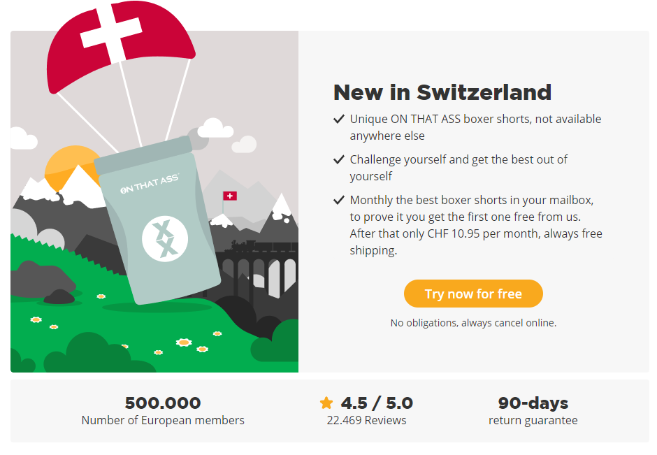"Nach der Registrierung beginnt deine 14-tägige Probezeit und du erhälst deine kostenlose Boxershorts innerhalb von 10 Werktagen. Innerhalb deines 14-tägigen Testzeitraums wird kein Geld von deinem Konto abgebucht. Keine Verpflichtungen! Du bist immer noch überzeugt und willst nie wieder etwas anderes? Prima! Wir buchen den Mitgliedsbeitrag in Höhe von 9,99€ um den 27. ab und liefern ab dem 17. des folgenden Monats. Versandkostenfrei."