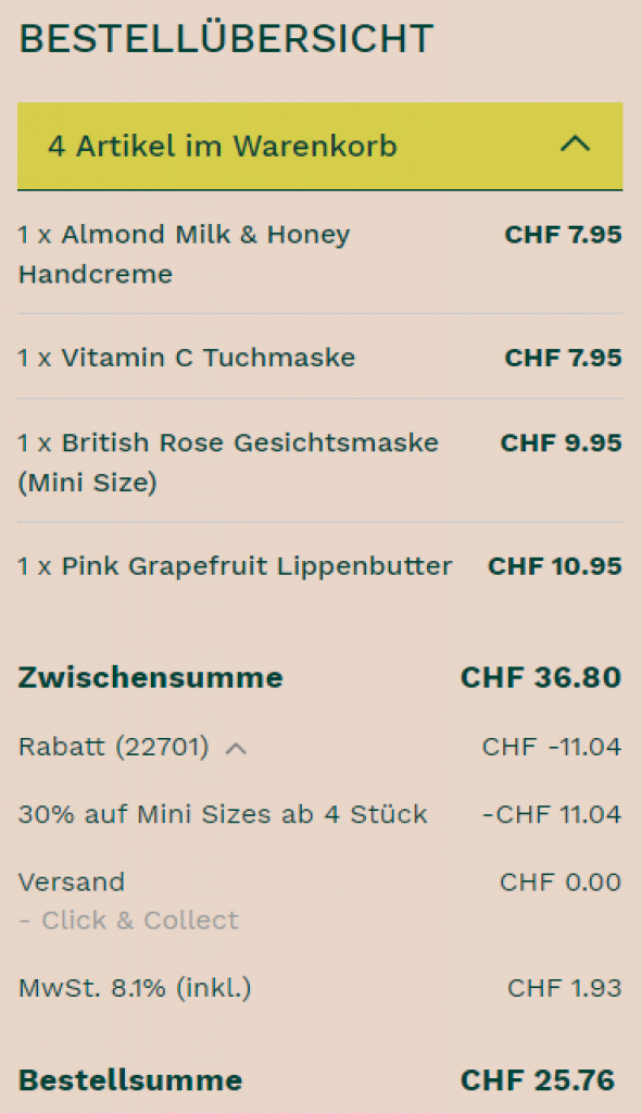 Bei The Body Shop gibt es aktuell 30% Rabatt auf alle Mini Sizes ab 4 Produkten. Ich habe mal einen Test Warenkorb für euch zusammengestellt. Am besten holt ihr den Artikel in einer Filiale oder an einer Pick-Up Station ab, denn so spart ihr euch die CHF 5.50 Versandkosten.