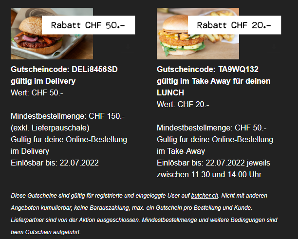 Diese Gutscheine sind gültig für registrierte und eingeloggte User auf butcher.ch. Nicht mit anderen Angeboten kumulierbar, keine Barauszahlung, max. ein Gutschein pro Bestellung und Kunde. Lieferpartner sind von der Aktion ausgeschlossen. Mindestbestellmenge und weitere Bedingungen sind beim Gutschein aufgeführt.