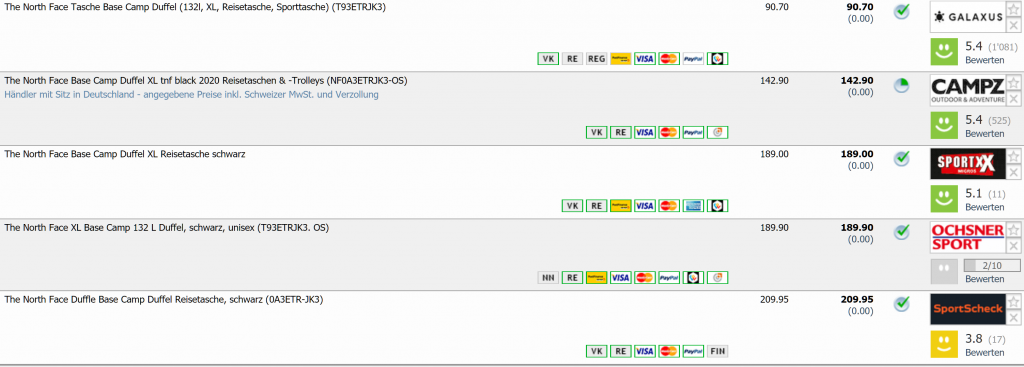 Bei Galaxus gibt’s gerade den The North Face Base Camp Duffel (132l, XL, Reisetasche, Sporttasche) für CHF 90.70 inklusive Versand. Zweitbester Preis beträgt CHF 142.90 Bestpreis bisher war bei CHF 102.-