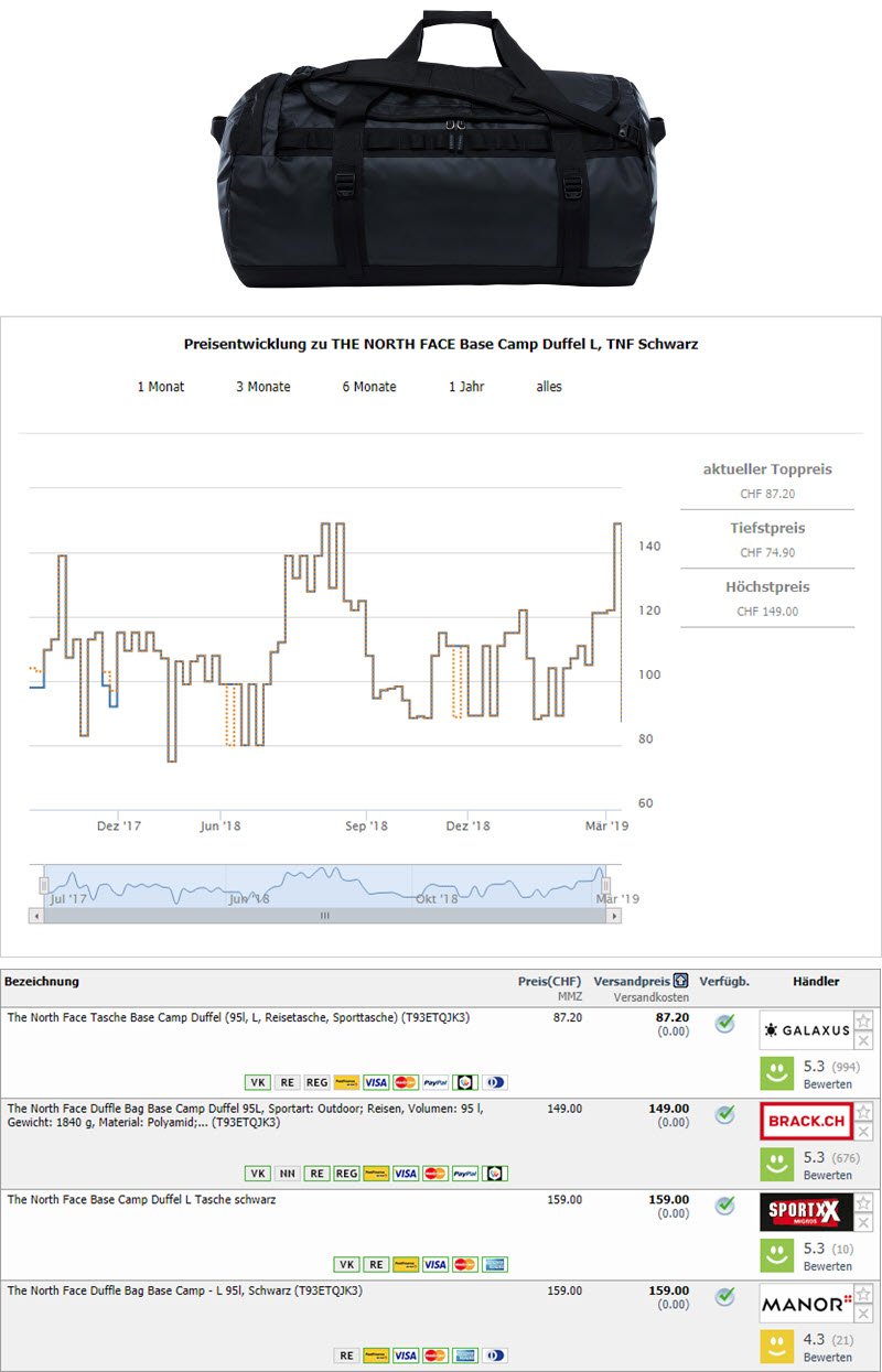 Momentan gibt es bei Galaxus die Base Camp Duffel (95l, L, schwarz) Reise- und Sporttasche von The North Face für CHF 87.20 (nächstbester Preis CHF 149.- bei Brack).