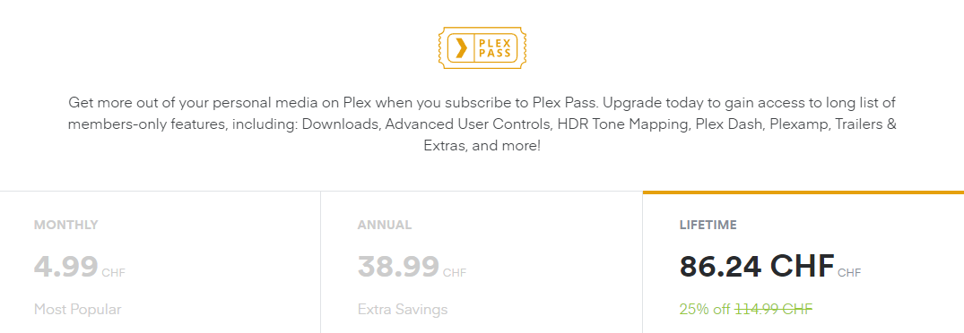 Für eine Woche habt Ihr die Möglichkeit, die Lifetime Plex Pass für CHF 86.24.- (25% Rabatt) zu ergattern!